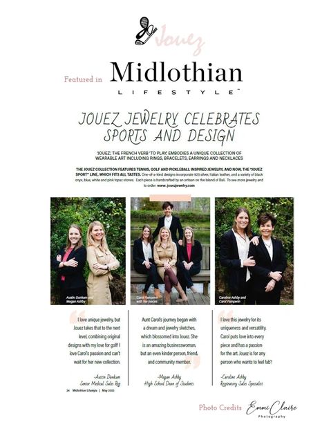Carol Pamperin, a Virginia native has played tennis all of her life. She wanted to celebrate her love of all sports by wearing sports-themed jewelry, but there were no collections that suited all occasions. Jouez Jewelry is personally designed by Carol and handmade by a silver artisan on the beautiful island of Bali. Jouez, the French verb "to play", captures the spirit of sport and wearable art.